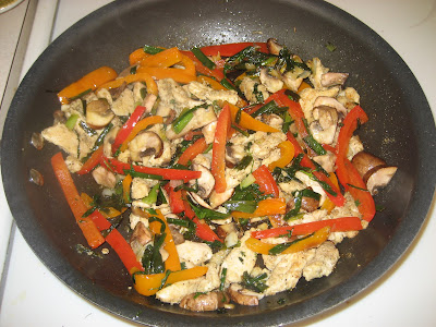 I also used some colored peppers, baby bella mushrooms that were on sale at Aldi, garlic from the farmers market and chicken breast. I seasoned it with onion and garlic powder, black pepper and cumin. (it’s better to season the meat before it’s cooked or as it’s cooking to hold more flavor)