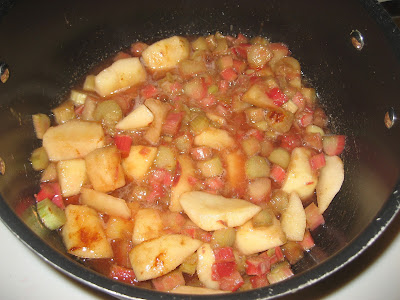 The apples and rhubarb cooking down in the pan with 1/3 cup sugar and a little bit of cinnamon. Made the house smell yummy!