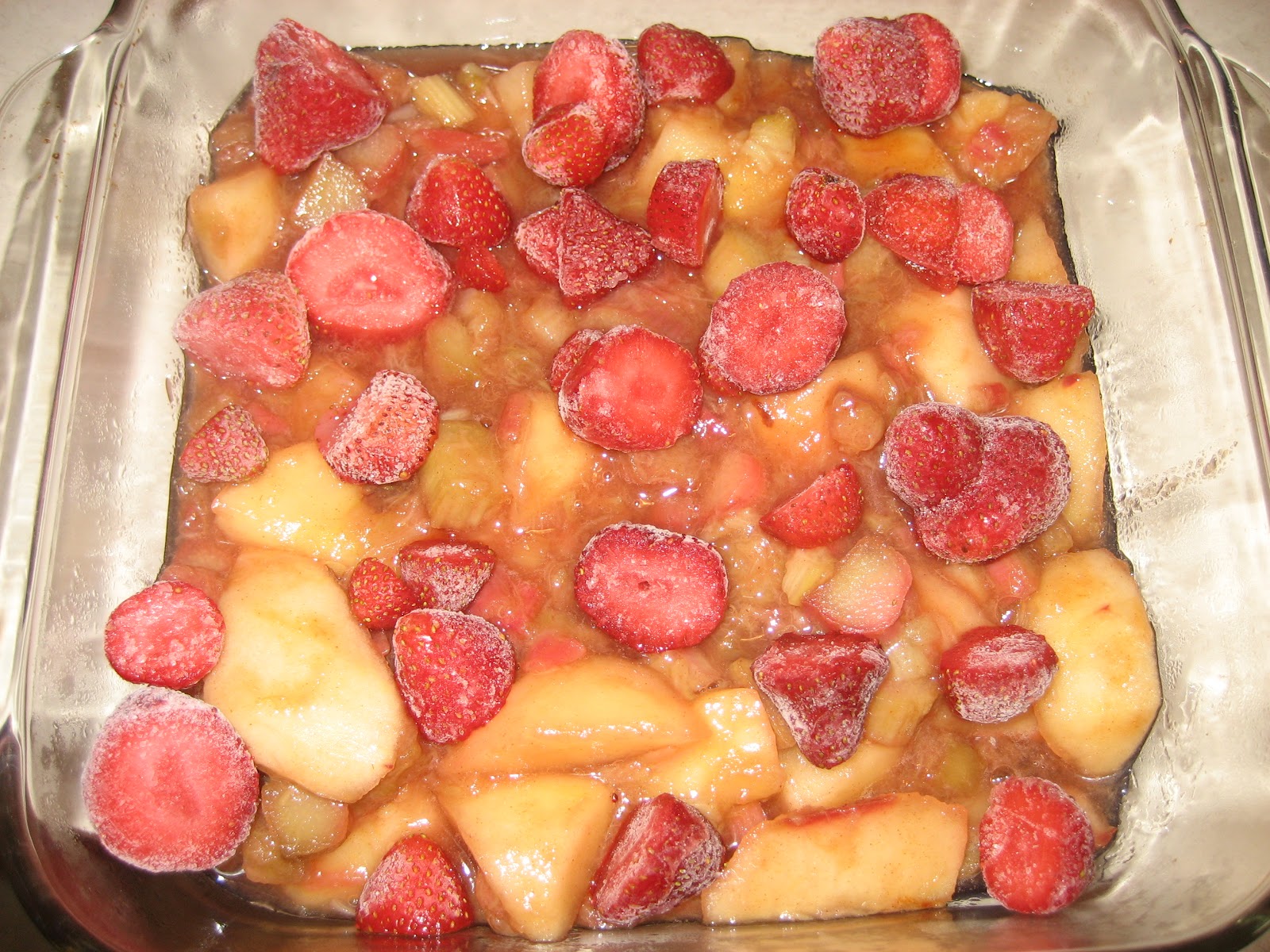 I put the rhubarb mixture in a pan and covered with the frozen strawberries.