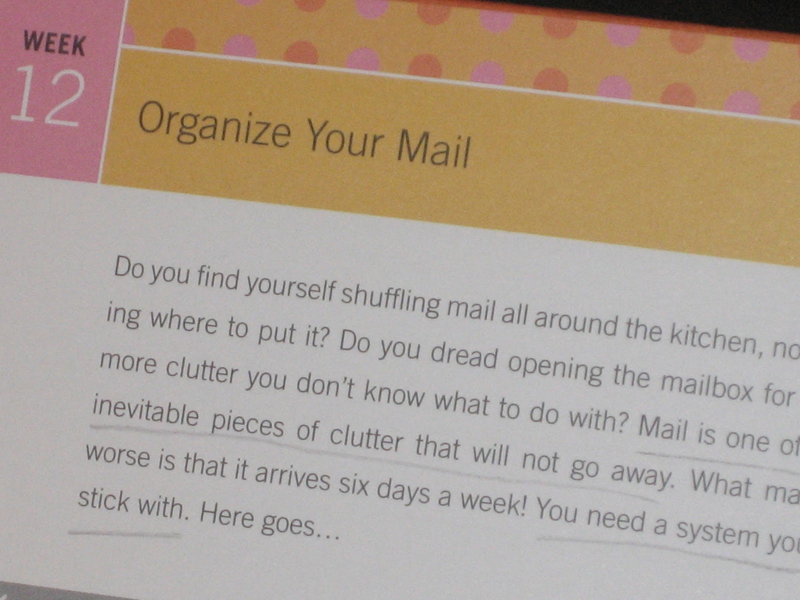 This week we are talking about organizing our mail. I don’t know about you, but we seem to get a LOT of junk mail. If we aren’t careful, it can take over and be so overwhelming. The Organize Now book has some useful tips that can help you develop a system for processing your mail and keeping your home less cluttered from it.