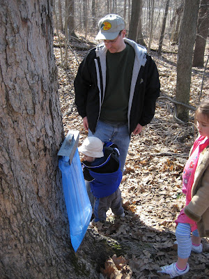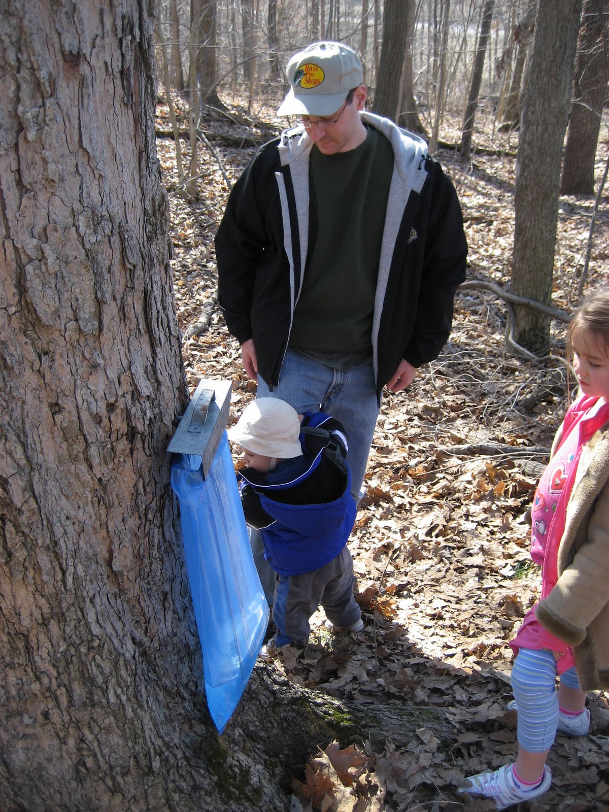 The blue bag is collecting the sugar water from the maple tree. Judging by the tree’s size, it is not too young! We took this tour at a sugar camp and it was really interesting.
