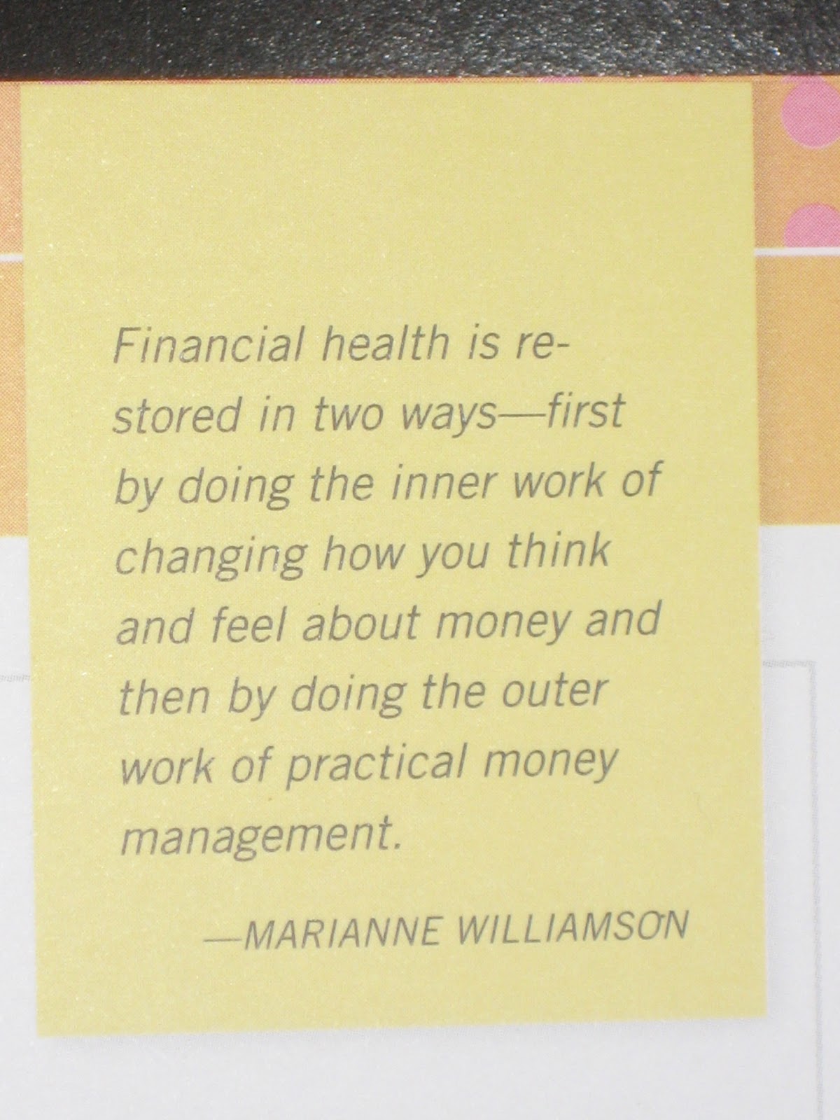 Organizing your finances! If you want a good example of how to do this, you should talk to my dear husband. He is SO GOOD at this and I am SO THANKFUL because I am not too good at it. Since my husband takes care of our personal finances, we are A-OK in that area. But I am in charge of my business finances, and am using this chapter to help me with it. In 2006 we were in San Diego and I was working a lot ( before kids,) I kept really pretty good records. I knew I had to for tax reasons since I was making good money as a music therapist and flute instructor and had a lot going on with my business. I got in good habits right from the start.