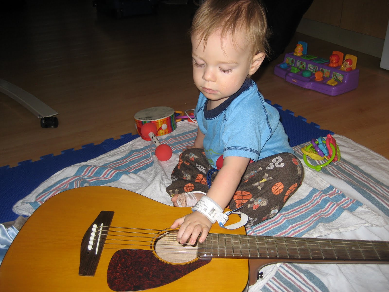 He had a visit from Caitlin, the music therapy intern from Iowa, again today. It was fun to see him interact with her more in the session. The last time he saw her, he was still on the PICU and not able to do a whole lot. I forgot to take pictures while she was there but she did have a guitar that she left in the room that I used with him so I have a few pictures of him exploring that.He ate like a champ in the hospital once he could have solids again.