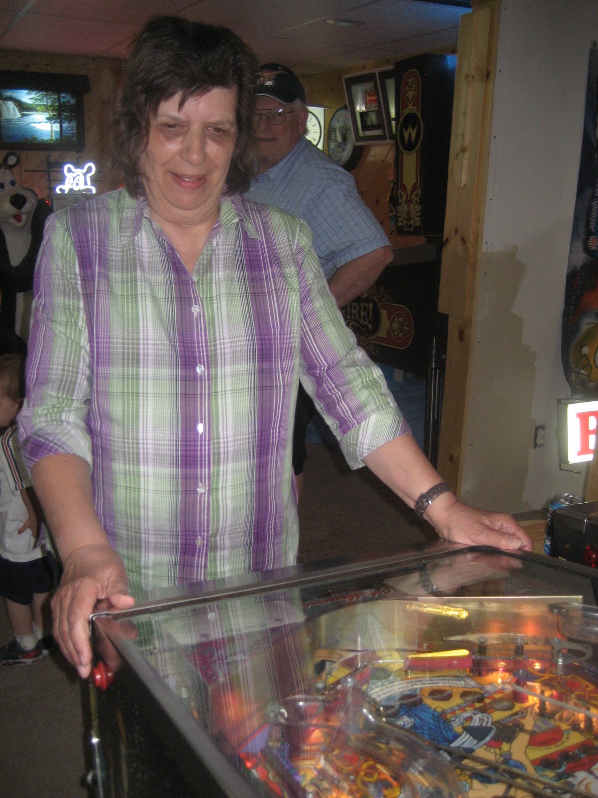 After THAT (yes, there’s more!) we headed down the interstate an hour to my brother’s house to celebrate Father’s Day. My brother has an actual arcade in his basement and all of the kids (big and little) LOVE it! Here’s Andrew with my dad playing the bowling game.