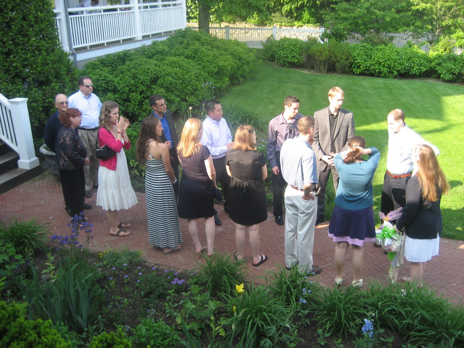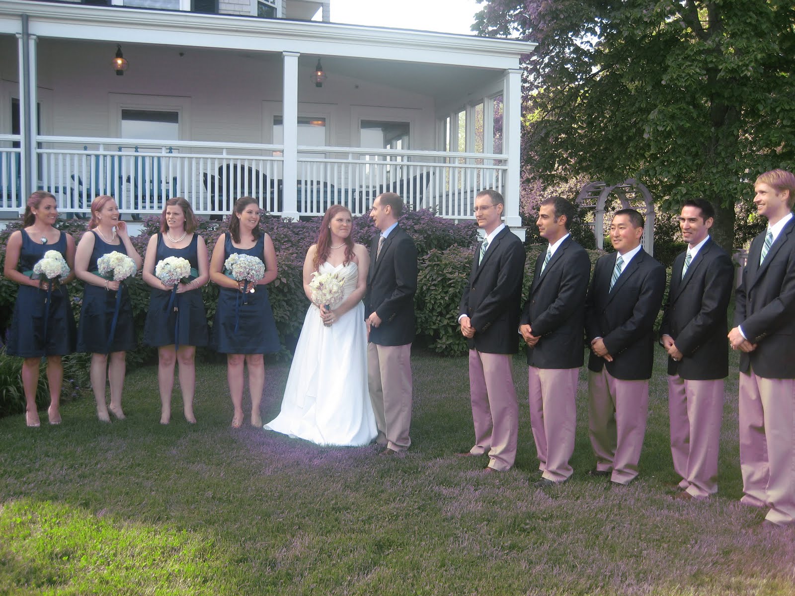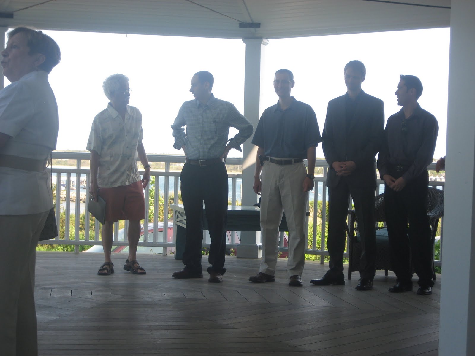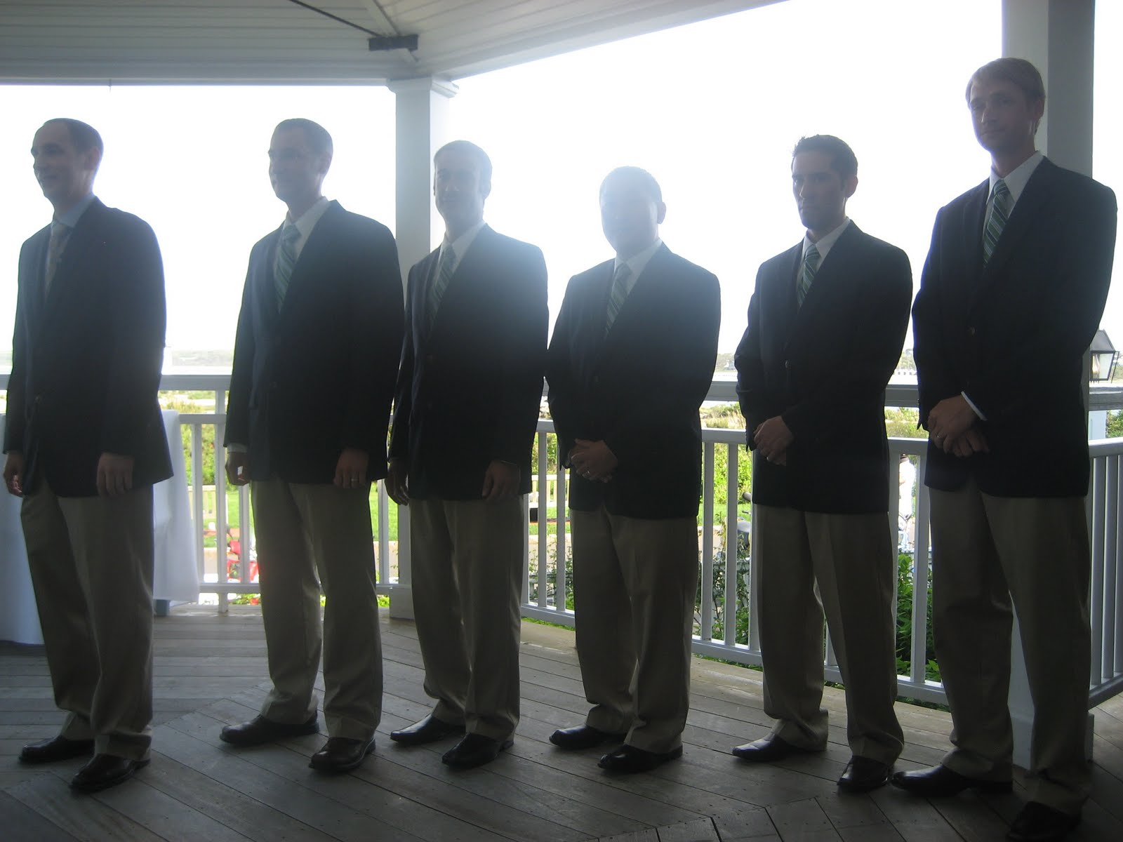 This is at the rehearsal the day before the wedding. The officiant is on the left talking to my brother in law Glenn, who was the groom. My husband David is next followed by two of the groomsmen, Jason and Gary.