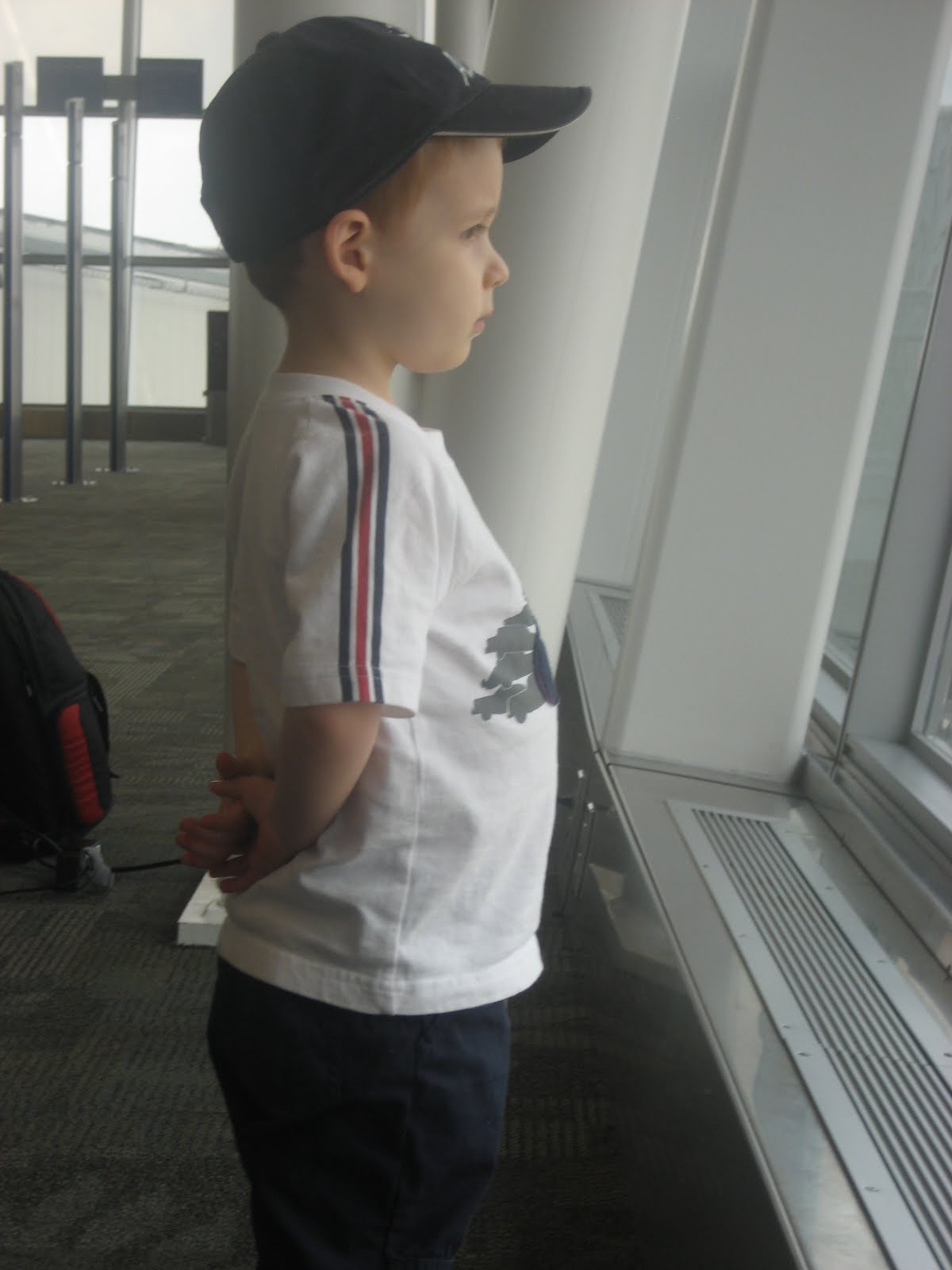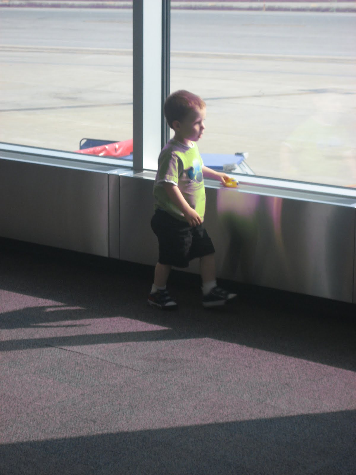 This is my oldest, Andrew. He will turn 3 in the fall ( I can hardly believe it!) He is AMAZED by any type of vehicle – cars, trucks, trains and of course Planes! So he absolutely loved waiting for our plane in the airport. It did not phase him one bit that the storms that day kept our plane on a 3 hour delay, making us miss our connection in Baltimore where we ended up flying stand by. The more time in the airport for him, the better! 🙂