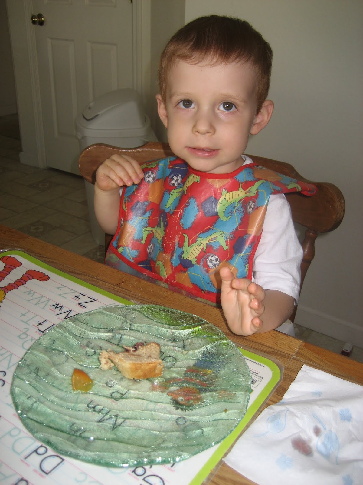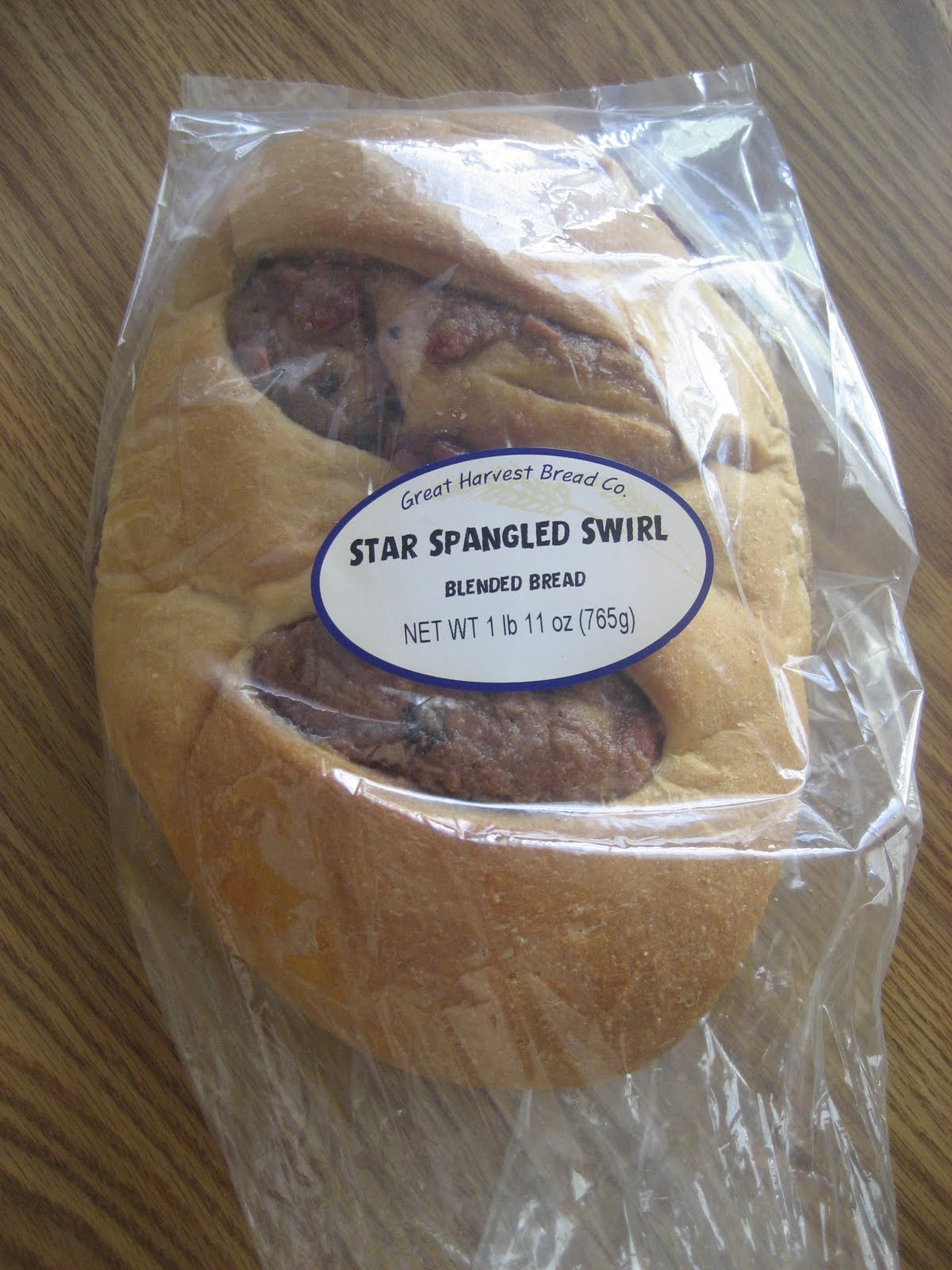 It is one of their special breads that they have around the 4th of July. It has cranberry, blueberry and cinnamon in it. Yum – O!!! My toddler kept asking for more. I think he gets his bread addiction from me. lol